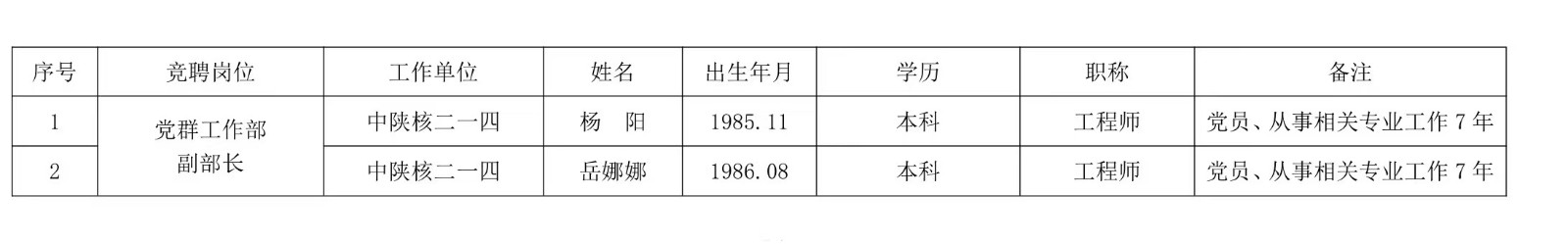 根據《中陜核工業集團二一四大隊有限公司黨群工作部副部長崗位公開選聘的工作方案》有關要求,現對資格審查通過的報名人員予以公示: