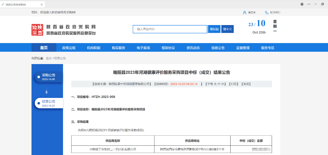 10月23日,自陜西省政府采購網獲悉,公司成功中標《略陽縣2023年河湖健康評價服務采購項目》。