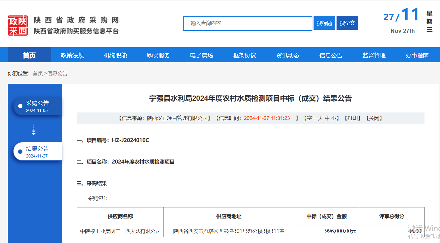 11月27日,公司物化探院成功中標寧強縣水利局2024年度農(nóng)村水質(zhì)檢測項目第一標段,中標金額99.6萬元整。