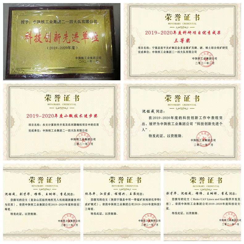 在集團公司第四屆科技大會上,公司獲得集團“科技創新先進單位”,物化探院沈銘成同志被評為2019-2020年度“科技創新先進個人”。地調院完成的“寧強縣陽平關礦集區金多金屬礦及磷、硒、稀土綜合找礦研究”項目被評為2019-2020年度科研項目優秀成果三等獎,物化探院張選鵬完成的“水文計算軟件開發及在河湖確權項目中的應用”項目獲得2019-2020年度小微技術進步獎。物化探院劉才華、沈銘成、穆偉、王樹祥、李元撰寫的論文“MakeUAVLinesandKml程序開發及其應用”榮獲集團公司2019-2020年度科技論文一等獎,物化探院劉才華、沈銘成、穆偉、王樹祥、李元撰寫的論文“復雜山區起伏地形無人機航磁測量技術研究與應用”榮獲集團公司2019-2020年度科技論文二等獎,地調院紀冬平、江宏君、程博興、王淮撰寫的論文“陜西寧強縣中壩一帶錳礦床地球化學特征及成礦模式”榮獲集團公司2019-2020年度科技論文三等獎。