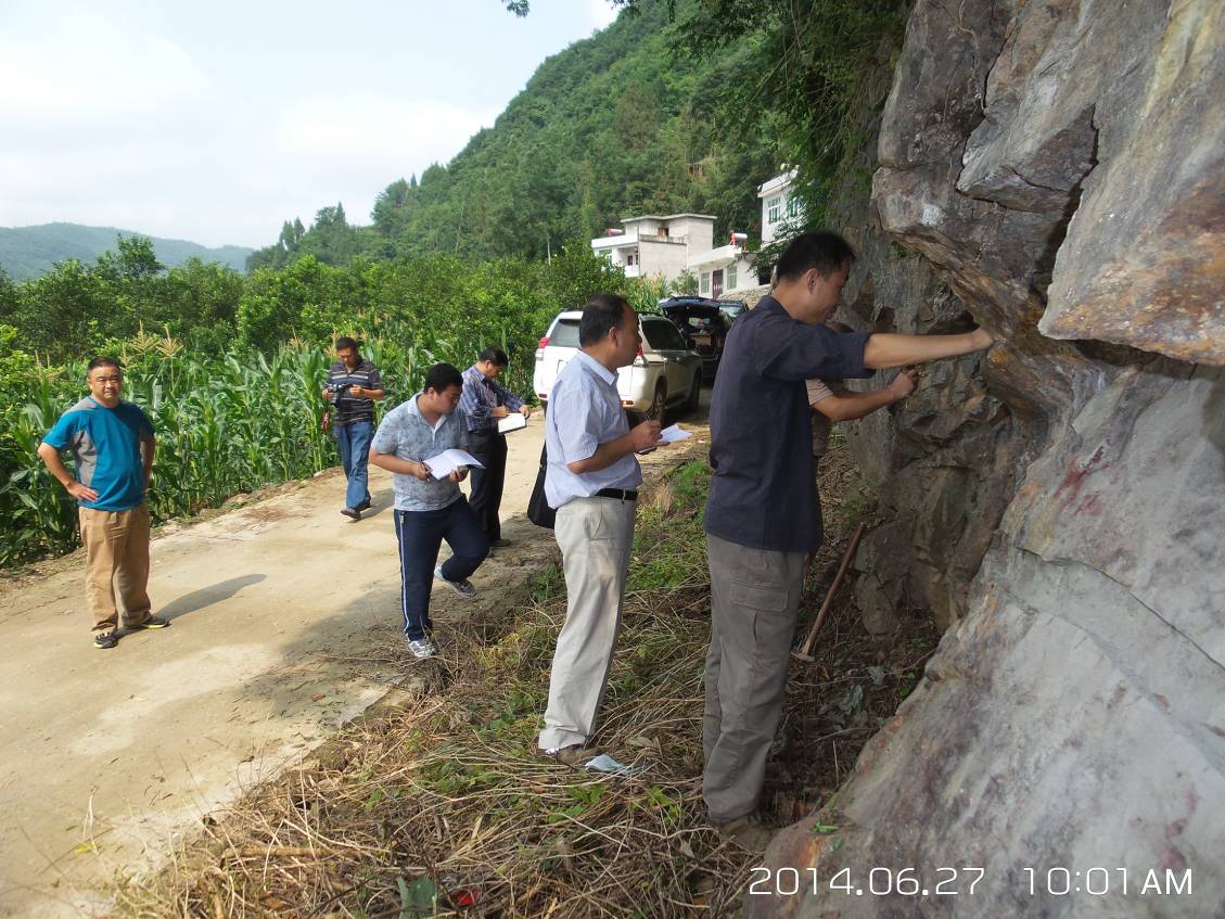 2014年6月26-27日,省基金辦專(zhuān)家張銀龍、張啟、王善勛、李耕(中陜核集團(tuán)副總工程師)、宋工(安康市國(guó)土局工程師)一行,在214大隊(duì)副大隊(duì)長(zhǎng)金衛(wèi)平、214大隊(duì)副總工程師兼地調(diào)院院長(zhǎng)王義忠陪同下,對(duì)214大隊(duì)地調(diào)院承擔(dān)的“陜西省紫陽(yáng)縣漢王城地區(qū)金多金屬礦普查” 項(xiàng)目進(jìn)行了野外驗(yàn)收。