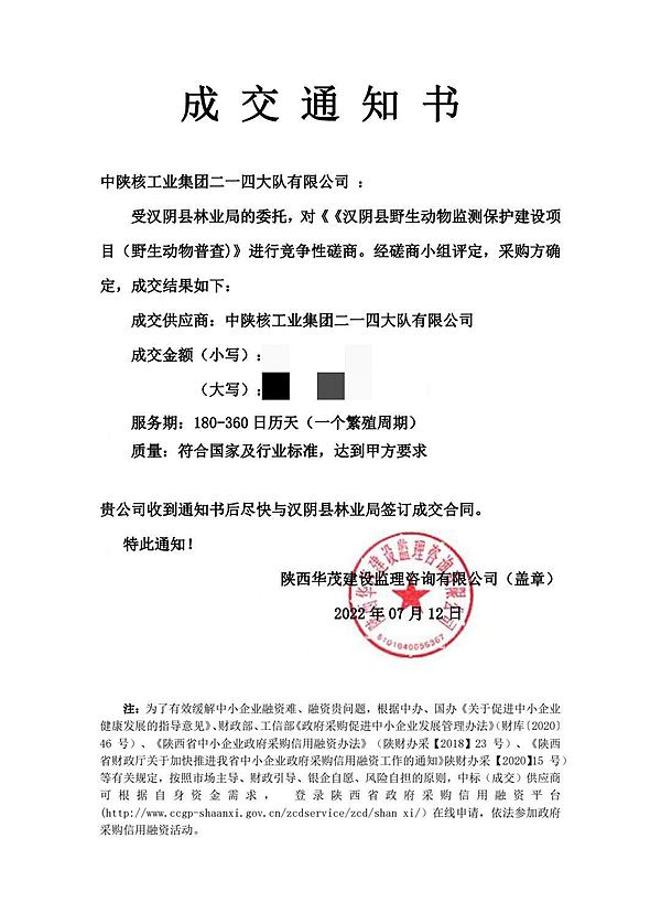 近日,公司水工環(huán)院成功中標(biāo)《漢陰縣野生動物監(jiān)測保護(hù)建設(shè)(野生動物普查)》項目。