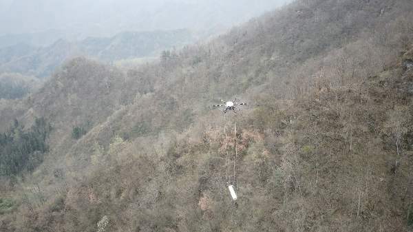 該項目地處陜南湖北交界地區(qū),工區(qū)地形切割強烈,山勢極為陡峭,垂直高差近650米,普通地表物探手段根本無法施工。項目組采用了長航時油電混合動力多旋翼無人機,搭載高精度鉀光泵磁力儀等先進設備,通過自主研發(fā)的起伏地形航線規(guī)劃軟件技術進行超低空仿地形飛行,有效保障了數(shù)據(jù)的采集質(zhì)量。